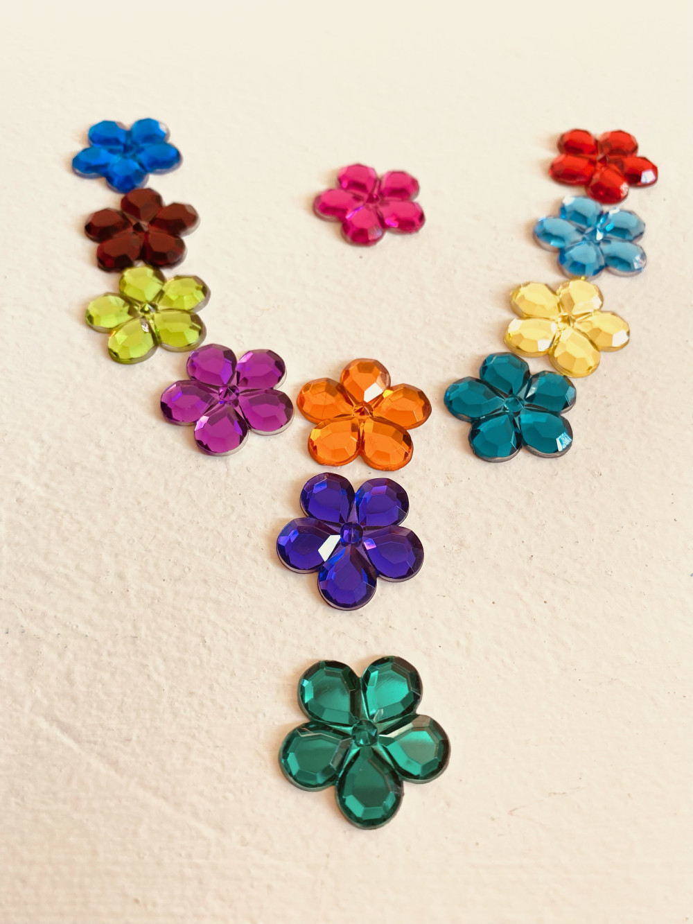 12 színből álló szett, mindegyik színből 2-2 darab csillogó virág.