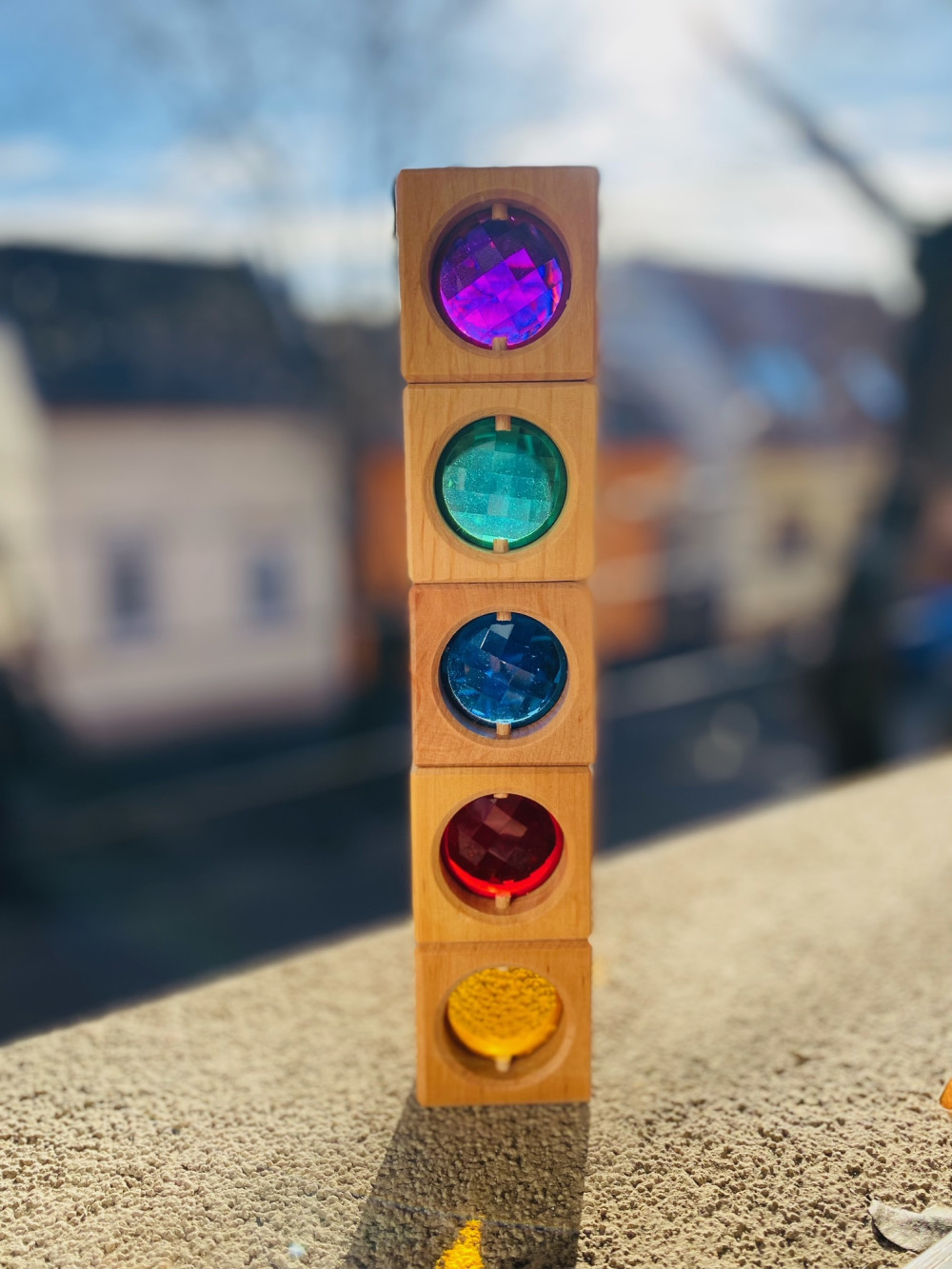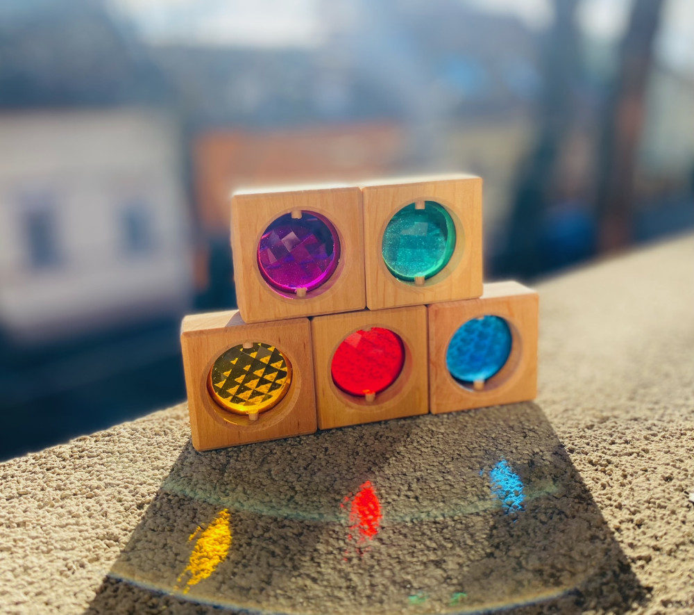 5 darab égerfa kocka, 5 különböző színű csillogó ablakkal, mindegyikből 1-1 darab.