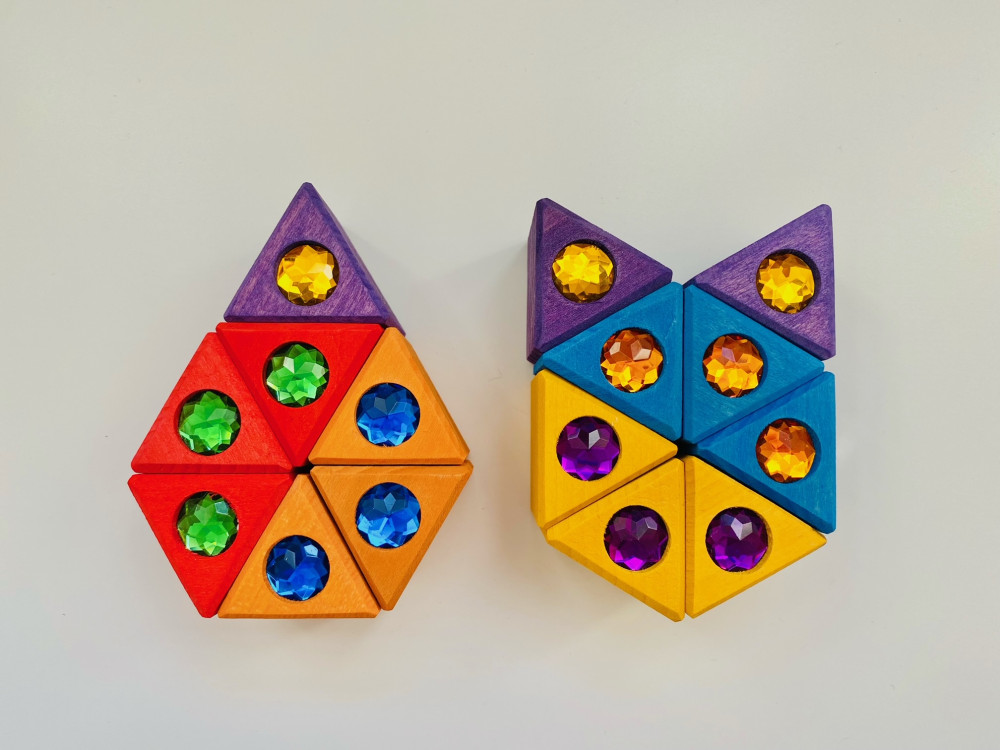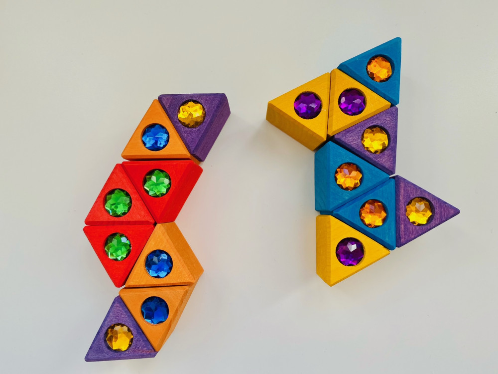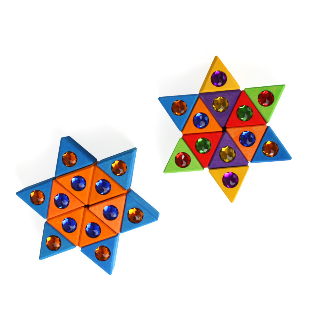 A szett tartalma: 6 színből álló 18 darabos háromszögek, egyik felén csillogó kővel, fa keretben.