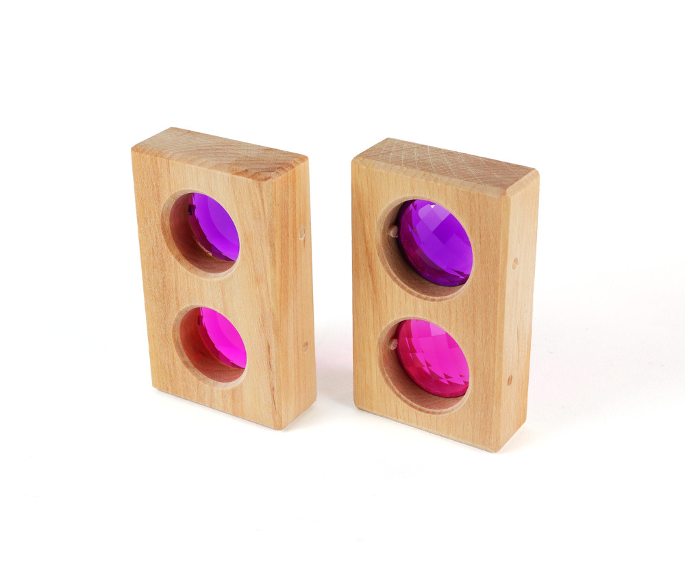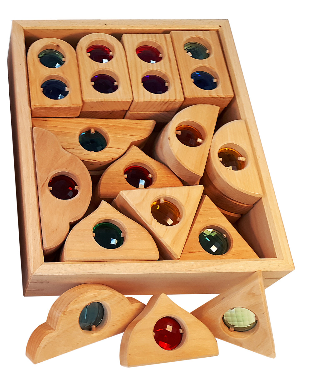 A szett tartalma: 6 különböző forma - 6 darab formánként, áttetsző színes ablakokkal, natúr színben, fa keretben.