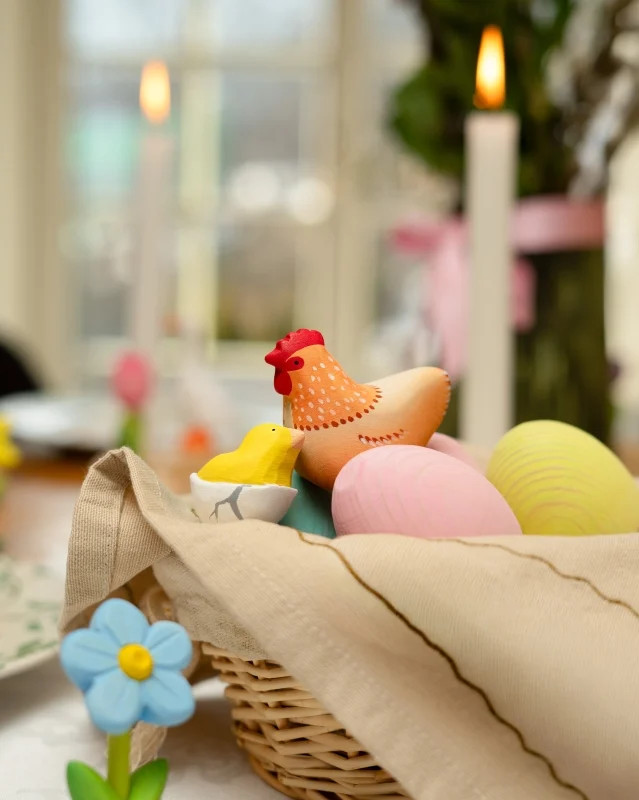 A figura kézzel készült természetes fából, és nem mérgező festékekkel festették. Mérete és formája a kisgyermekek kezéhez igazodik, így játék közben segíti a finommotorikus készségek, a koordináció és a kreativitás fejlődését. Tökéletes kiegészítő a Grimm’s ünnepi körhöz, vidám hangulatot adva a tavaszi és húsvéti dekorációknak.