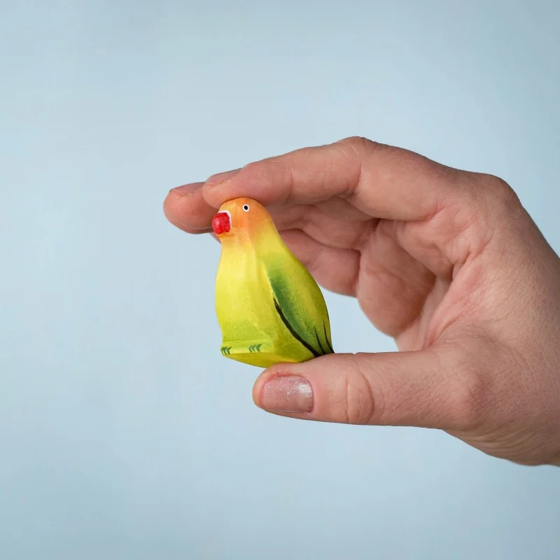 Fedezd fel a Bumbu Toys lenyűgöző afrikai törpepapagáj párját, amely egy gyönyörűen kidolgozott fatörzsön pihen! Ez a kézzel faragott és festett fafigura természetes anyagokból készült, így biztonságos, tartós és környezetbarát választás. Az élénk színű papagájok és a részletgazdag fatörzs élethű megjelenést kölcsönöz a játéknak, amely tökéletesen illeszkedik egy egzotikus állatvilágot bemutató gyűjteménybe. Ideális szerepjátékokhoz, természetismerethez vagy akár dekorációként a gyerekszobába. Egy különleges darab, amely a madárrajongók és a kis felfedezők kedvence lesz!