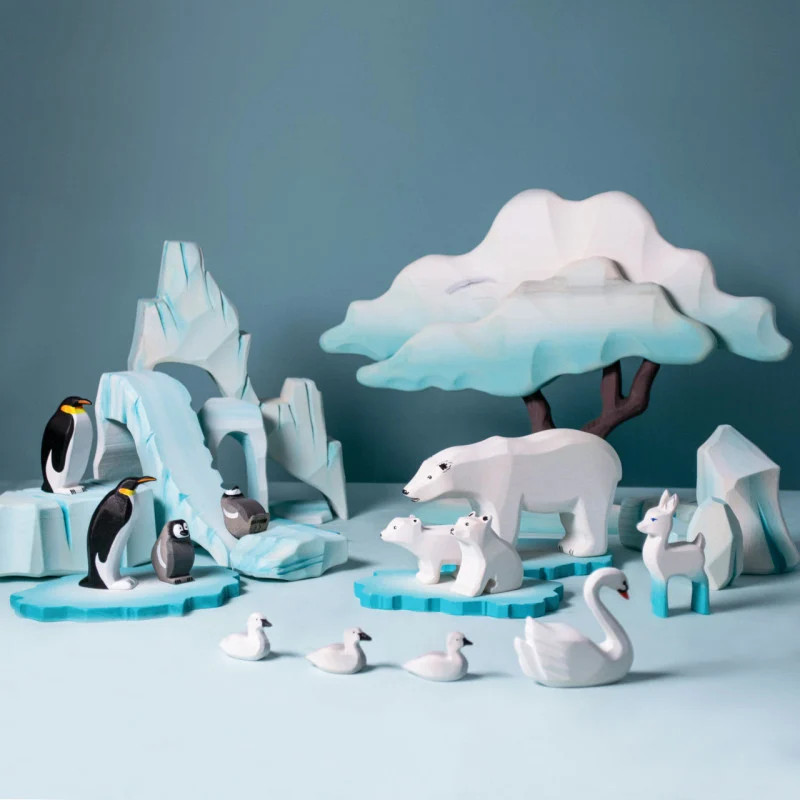 Hozd közelebb a természetet és a kreativitást a gyermekeidhez ezekkel a varázslatos kézzel készült Bumbu Toys fajáték jegesmedve családdal! Az északi sark egy szegletét varázsolhatjátok a játékba! Mindegyik medve részletgazdagon, kézzel festett.