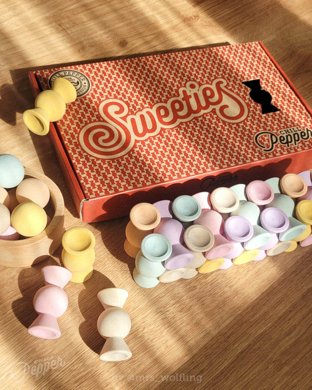 A Chill Pepper Sweets „Peachy Pastels” készlet igazi vizuális élmény: lágy barackos pasztell árnyalatok, klasszikus csomagolt cukorka formák és gömbölyű rágógolyók – de mindez fából, játékra tervezve.