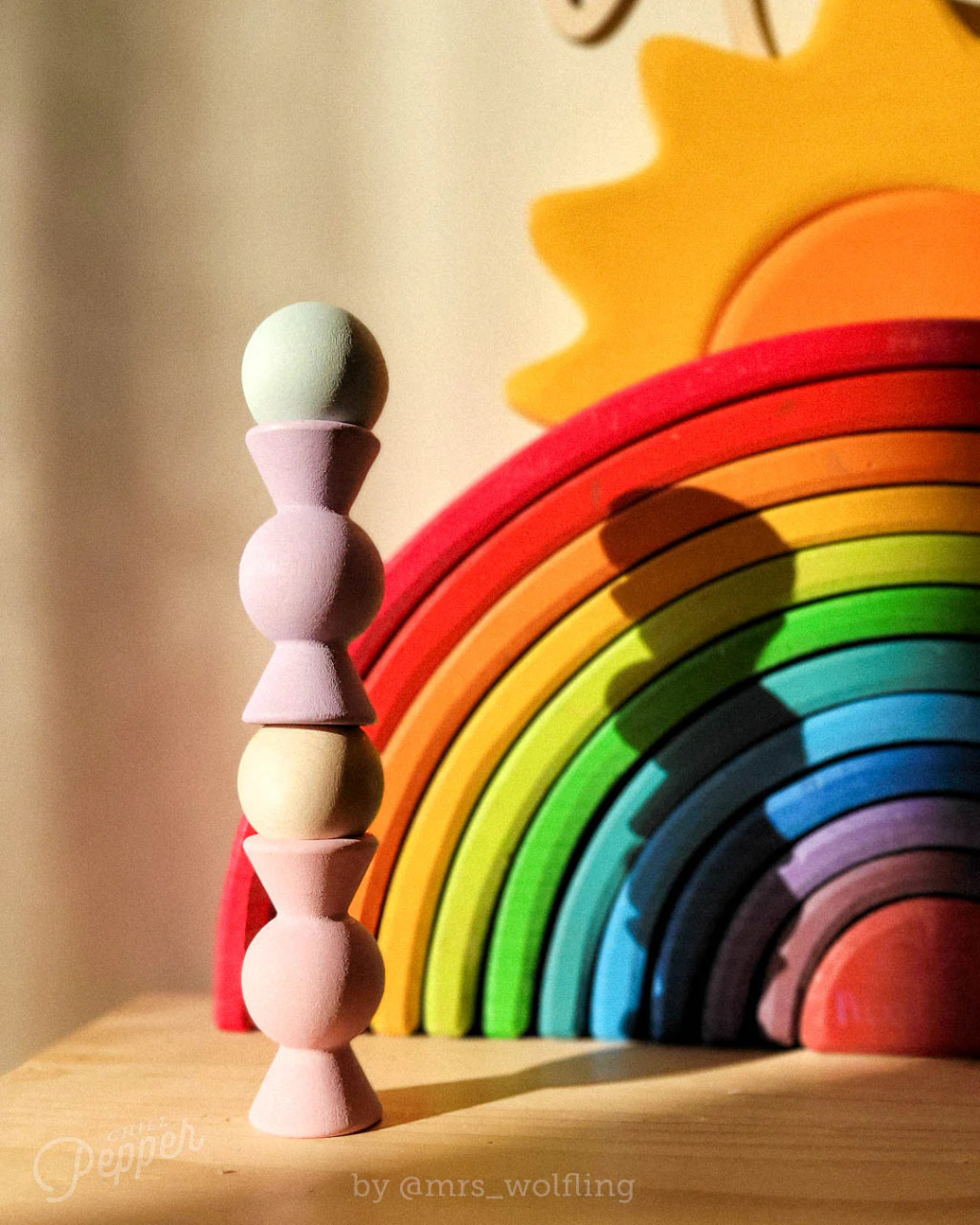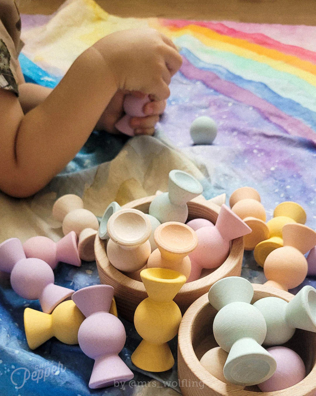 Összesen 33 darab fa elem barackos pasztell árnyalatokban: