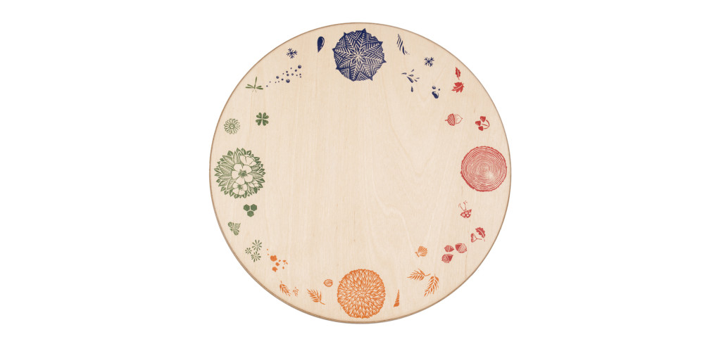 Az Évszakok és Elemek tál egy gyönyörű, kerek fa alap, amelyen a négy évszak és a négy természeti elem – föld, víz, levegő és tűz – kézzel rajzolt motívumai jelennek meg.