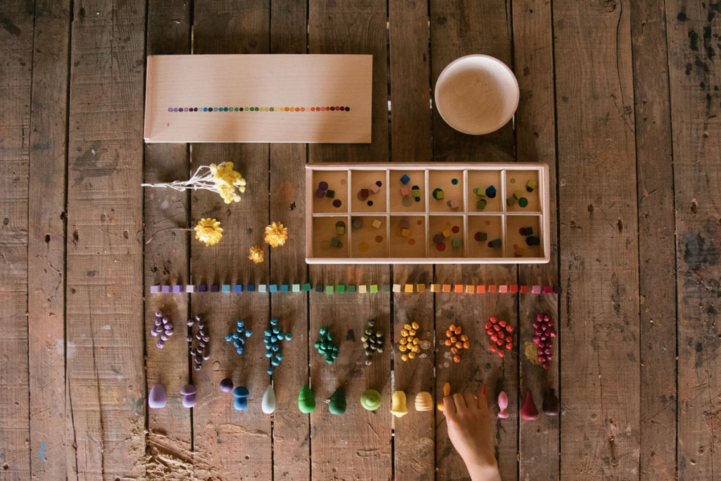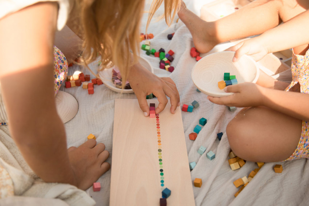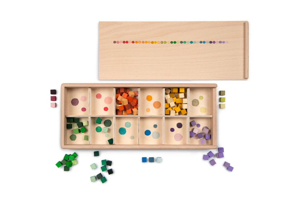 A kockák a szivárvány 36 finoman átmenetes színárnyalatában készültek, így a játék nemcsak fejlesztő, hanem látványában is inspiráló. A készlet része egy kézzel festett fa válogatódoboz, amely segíti a színek szerinti rendezést, és a pakolást is egyszerűvé teszi.