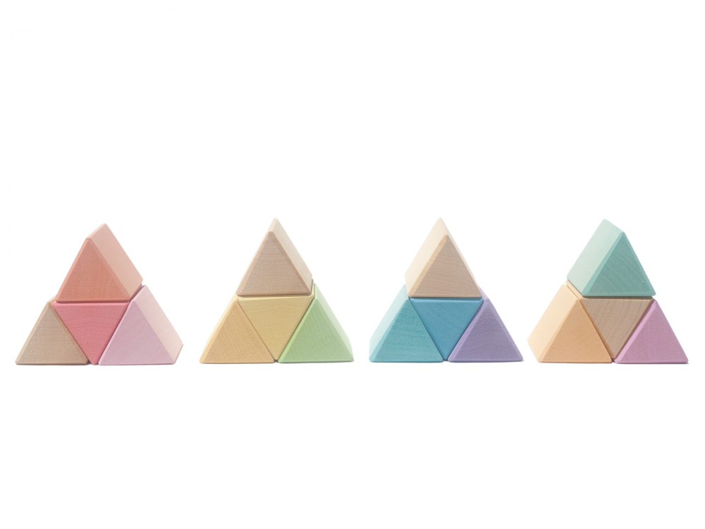 A szett tartalma: 16 darab 4 cm-es háromszög fa prizma, fa tálcán. 12 darab pasztell színű és 4 darab natúr.
