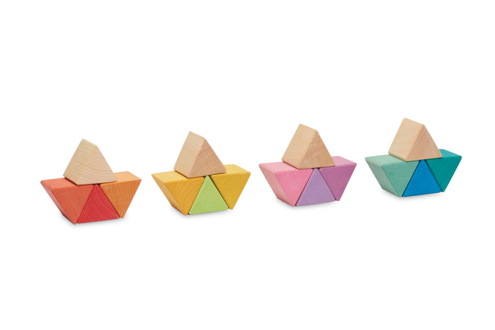 A szett tartalma: 16 darab 4 cm-es háromszög fa prizma, fa tálcán. 12 darab színes és 4 darab natúr.