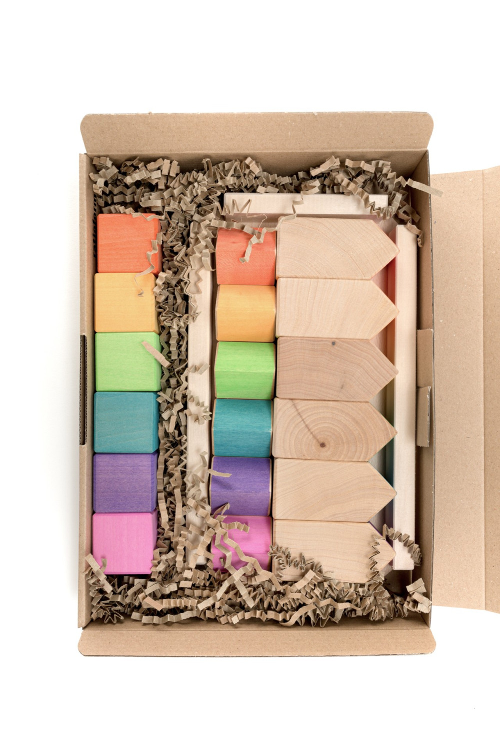 A szett különböző geometriai formákat kombinál natúr és színes fából.