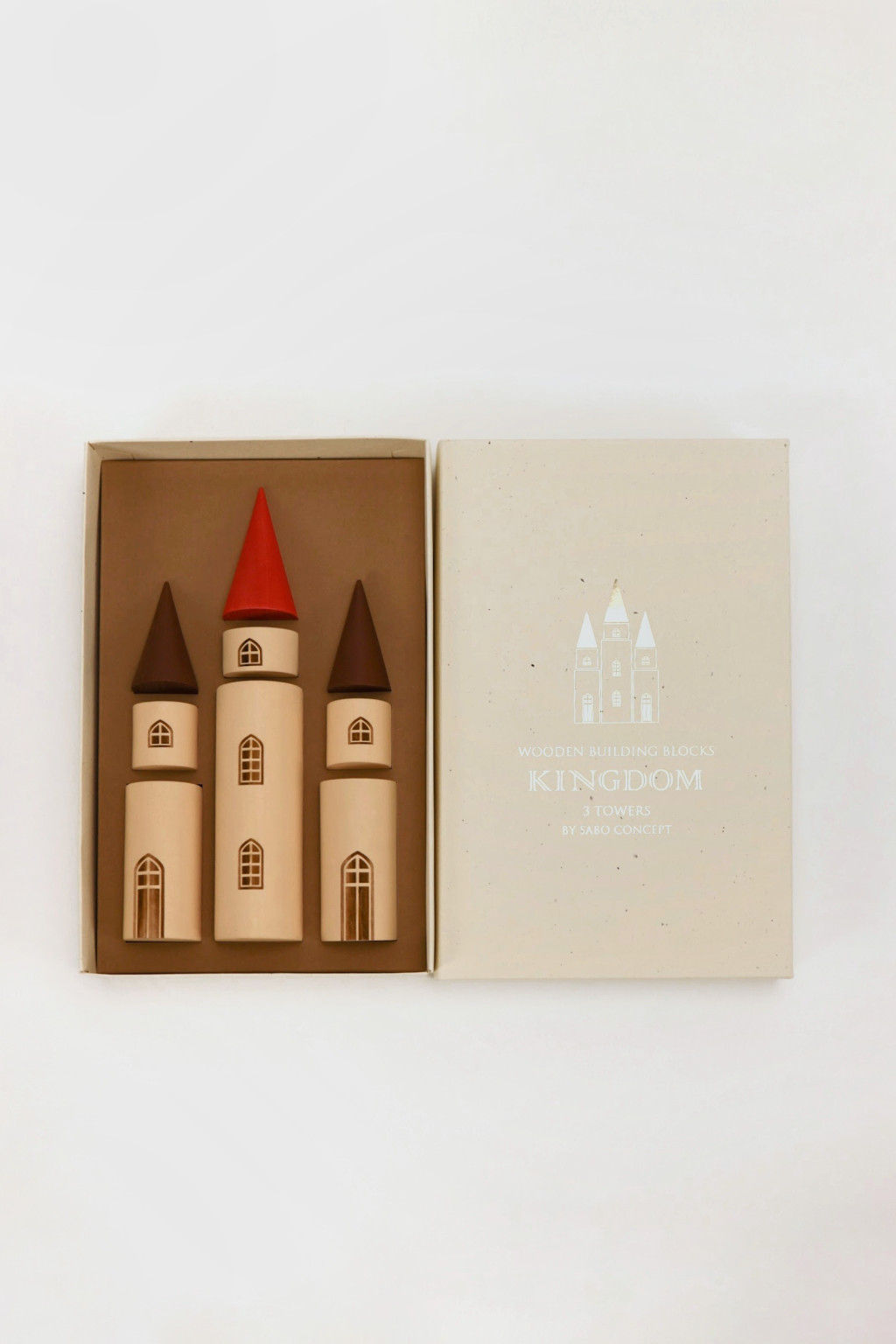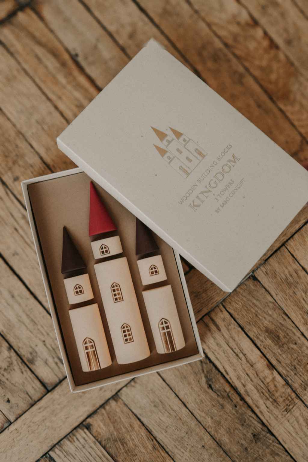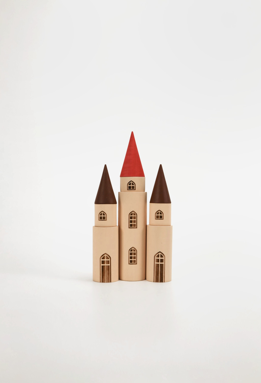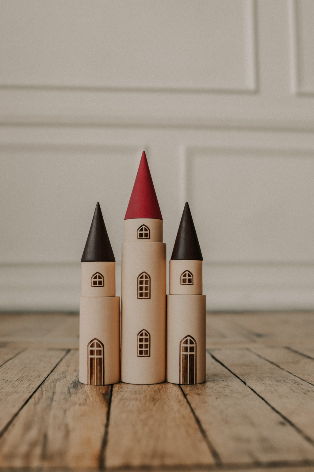 A részek kombinálhatók, így a gyerekek saját tündérmesés kastélyukat építhetik kreatívan és szabadon. Minden darabot vízbázisú festékkel festettek, amely megőrzi a fa természetes szerkezetét.
