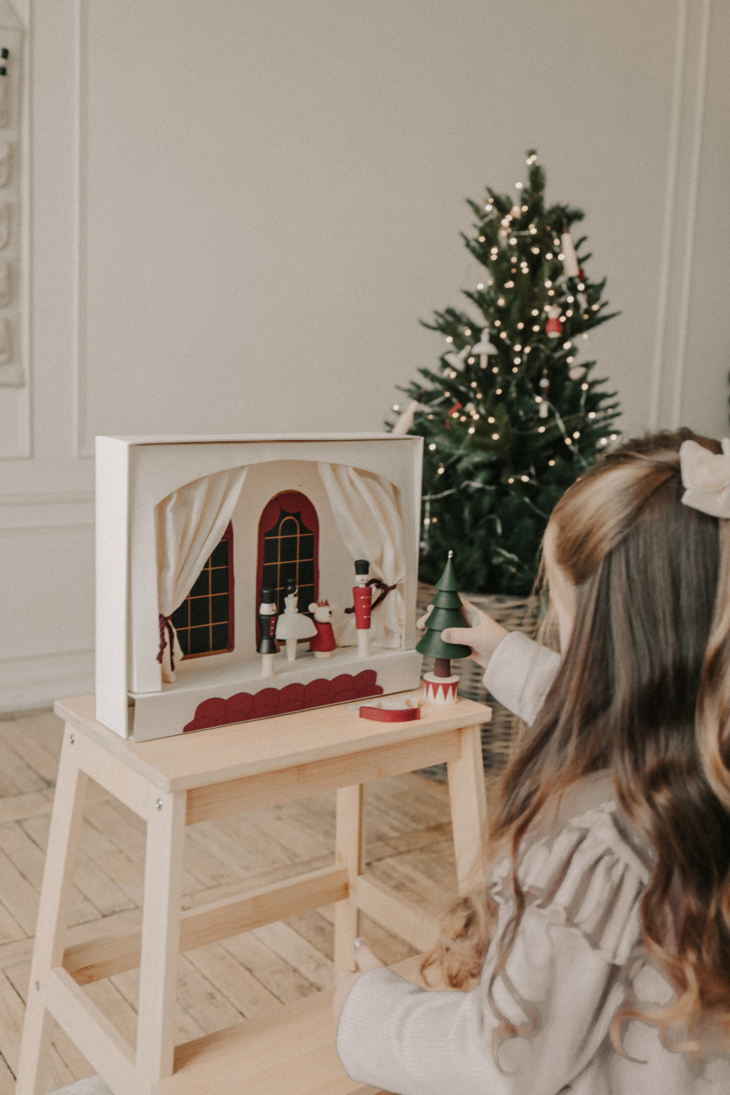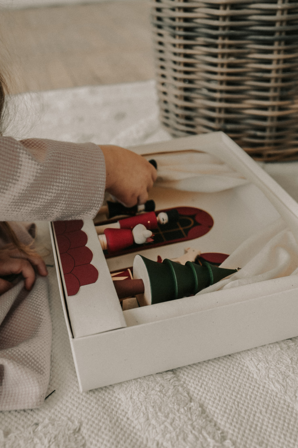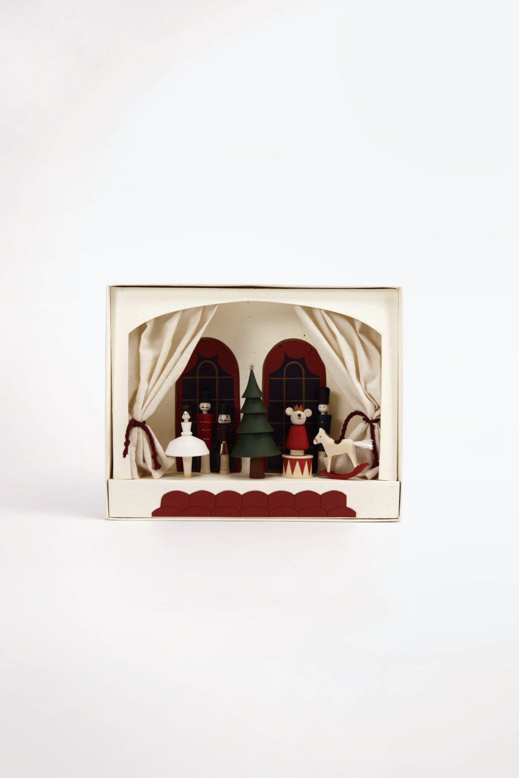Ez a különleges játékszett nem csak gyönyörű karácsonyfadíszek gyűjteménye, hanem mini színház is, amelyben a gyerekek eljátszhatják a híres Diótörő történetét.