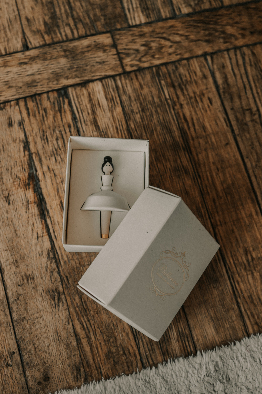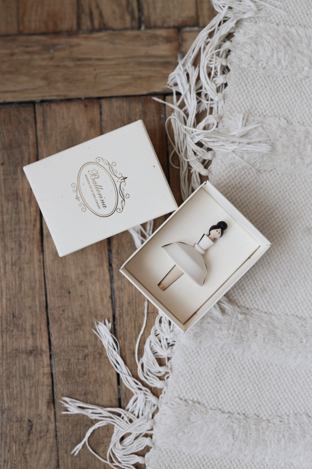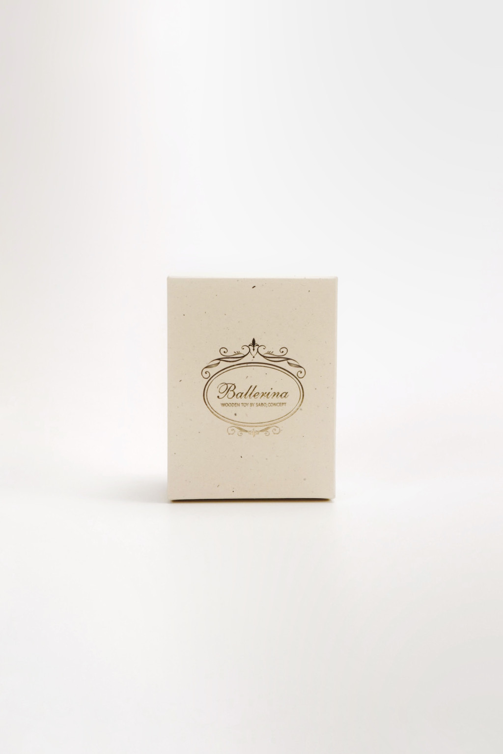 Egy varázslatos balerina figura, elegáns, aranyozott díszdobozban. A figura ruhája vízbázisú festékkel készült, amely megőrzi a fa természetes struktúráját. A haj, a szemek és a lábak kézzel, akril festékkel vannak festve.