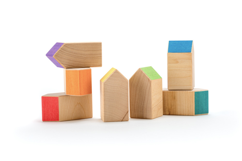 A szett tartalma: 7 db különböző színű tetejű fa házikó.